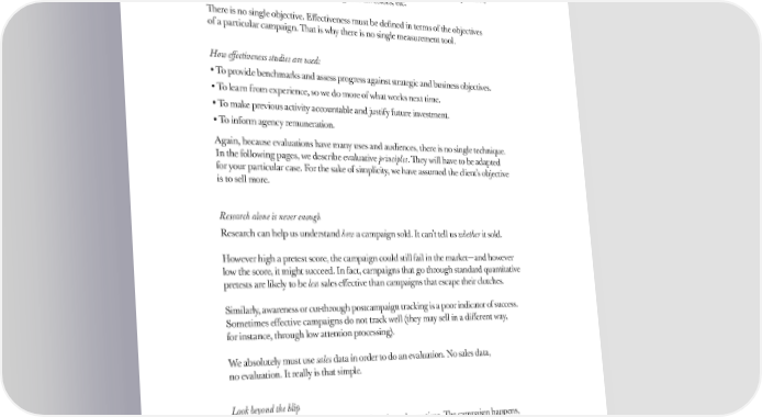 What is “effectiveness”? Effectiveness can be defined as a beneficial outcome for the client. Marcomms are used for a huge variety of purposes: to sell products, to reduce road accidents, to stimulate charitable donations, to encourage intermediaries to recommend the client’s product, to present corporations in a favorable light to investors, etc. There is no single objective. Effectiveness must be defined in terms of the objectives of a particular campaign. That is why there is no single measurement tool. How effectiveness studies are used: • To provide benchmarks and assess progress against strategic and business objectives. • To learn from experience, so we do more of what works next time. • To make previous activity accountable and justify future investment. • To inform agency remuneration. Again, because evaluations have many uses and audiences, there is no single technique. In the following pages, we describe evaluative principles. They will have to be adapted for your particular case. For the sake of simplicity, we have assumed the client’s objective is to sell more. Research alone is never enough Research can help us understand how a campaign sold. It can’t tell us whether it sold. However high a pretest score, the campaign could still fail in the market — and however low the score, it might succeed. In fact, campaigns that go through standard quantitative pretests are likely to be less sales effective than campaigns that escape their clutches. Similarly, awareness or cut-through postcampaign tracking is a poor indicator of success. Sometimes effective campaigns do not track well (they may sell in a different way, for instance, through low attention processing). We absolutely must use sales data in order to do an evaluation. No sales data, no evaluation. It really is that simple. Look beyond the blip The following graph shows the sales of our brand over time. The campaign happens, and there is a blip in sales. After the blip, sales fall back to their previous level. 18