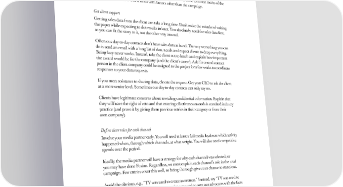 • Judges are hungry. They yearn to learn something that could help them in their own jobs. Don’t lobby them — inspire them. You are the teacher, not them. Judges at the IPA Effectiveness and Cannes Creative Effectiveness Awards will be more experienced and be under less time pressure. They will reward the technical merits of the case, in particular how well it deals with factors other than the campaign. Get client support Getting sales data from the client can take a long time. Don’t make the mistake of writing the paper while expecting to slot results in later. You absolutely need the sales data first, so you can fit the story to it, not the other way around. Often our day-to-day contacts don’t have sales data at hand. The very worst thing you can do is send an email with a long list of data needs and expect clients to drop everything. Being lazy never works. Instead, take the client out to lunch and explain how important the award would be for the company (and the client’s career). Ask if a central contact person in the client company could be assigned to the project for a few weeks to coordinate responses to your data requests. If you meet resistance to sharing data, elevate the request. Get your CEO to ask the client at a more senior level. Sometimes our day-to-day contacts can only say no. Clients have legitimate concerns about revealing confidential information. Explain that they will have the right of veto and that entering effectiveness awards is standard industry practice (and prove it by giving them previous entries in their category or from their own company). Define clear roles for each channel Involve your media partner early. You will need at least a full media laydown: which activity happened when, through which channels, at what weight. You will also need competitive spends over the period. Ideally, the media partner will have a strategy for why each channel was selected; or you may have done Fusion. Regardless, we must explain each channel’s role in the total campaign. Few entries cover this well, so being thorough gives us a chance to stand out. Avoid the obvious, e.g., “TV was used to create awareness.” Instead, say “TV was used to build a groundswell of popular support, print was used to arm our advocates with the facts they needed to take our brand’s side in the debate, activation was used to address value for money concerns,” etc. Show that everything was a facet of a central plan. 30