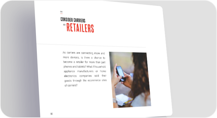 04 CONSIDER CARRIERS as RETAILERS As carriers are connecting more and more devices, is there a chance to become a retailer for more than just phones and tablets? What if household appliance manufacturers or home electronics companies sold their goods through the ecommerce sites of carriers? 100