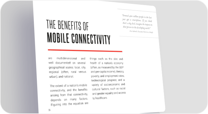 “Around 400 million people in the last year got a smartphone. If you think that’s a big deal, imagine the impact on that person in the developing world.” THE BENEFITS OF - Eric Schmidt, Executive Chairman, Google MOBILE CONNECTIVITY are multidimensional and things such as the size and well documented on several health of a nation’s economy geographical scales: local, city, (often, as measured by the GDP regional (often, rural versus and per-capita income); literacy, urban), and national. poverty, and employment rates; technological progress; and a The extent of a nation’s mobile variety of socioeconomic and connectivity, and the benefits cultural factors, such as racial arising from that connectivity, and gender equality and access depends on many factors. to healthcare. Figuring into the equation are 25