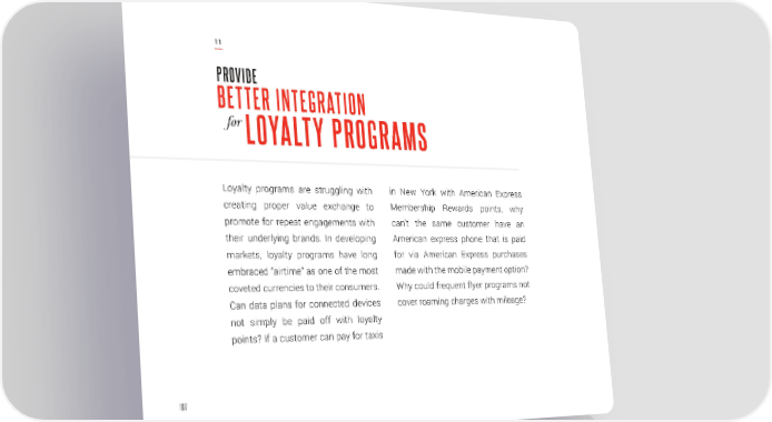 11 PROVIDE BETTER INTEGRATION for LOYALTY PROGRAMS Loyalty programs are struggling with in New York with American Express creating proper value exchange to Membership Rewards points, why promote for repeat engagements with can’t the same customer have an their underlying brands. In developing American express phone that is paid markets, loyalty programs have long for via American Express purchases embraced “airtime” as one of the most made with the mobile payment option? coveted currencies to their consumers. Why could frequent flyer programs not Can data plans for connected devices cover roaming charges with mileage? not simply be paid off with loyalty points? If a customer can pay for taxis 107