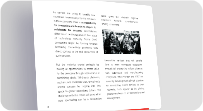 As carriers are trying to identify new tactic given the relatively negative sources of revenue and potential investors sentiment towards advertisements in the ecosystem, there is an opportunity among consumers. for companies and brands to step in to collaborate for success. Beneficiaries differ based on the region and their state of technology maturity. Some (few) companies might be looking towards becoming connectivity providers with direct contact to the end consumers of such services. Meanwhile, verticals that will benefit But the majority should probably be from a more connected ecosystem looking at opportunities to create value through IoT are starting to form alliances for the company through sponsorship or with automotive and manufacturing subsidizing deals. Third-party platforms, companies. While Verizon and AT&T are such as Jana and Opera Max, have already currently focusing much of their attention shown success by tapping into this on connecting mobile devices to their space to garner advertising dollars. The networks, both appear to be placing challenge with this model will be whether greater emphasis on IoT connections and pure sponsoring can be a sustainable management. 76