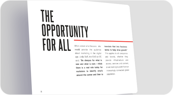 THE OPPORTUNITY When asked what lessons she translate that into business FOR ALL would provide the audience terms to help drive growth.” about marketing in the digital This applies to all companies age, Linda Boff, the CMO at GE, and brands, whether they said: “Be sherpas for what is provide infrastructure and new and what is next. I think access, services and content, there is a real role today for or are looking to profit from an marketers to identify what’s increasingly connected global around the corner and then to population. 116