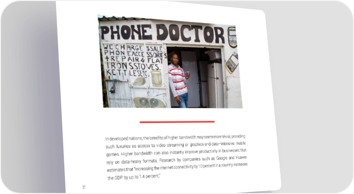 In developed nations, the benefits of higher bandwidth may seem more trivial, providing such luxuries as access to video streaming or graphics-and-data–intensive mobile games. Higher bandwidth can also instantly improve productivity in businesses that rely on data-heavy formats. Research by companies such as Google and Huawei estimates that “increasing the internet connectivity by 10 percent in a country increases the GDP by up to 1.4 percent.” 27
