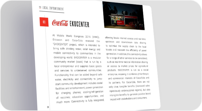 O2 LOCAL EMPOWERMENT O3 EKOCENTER At Mobile World Congress 2015 (MWC), allowing locals internet access and real-time Ericsson and Coca-Cola revealed the upstream and downstream data sharing “EKOCENTER” project, which is intended to to optimize the supply chain to the local bring safe drinking water, solar energy and kiosks and measure the efficiency of power mobile connectivity to communities in the generation. In addition, this connectivity allows developing world. EKOCENTER is a modular for a range of other services to be considered, community market (kiosk) that is run by a such as real-time medical information sharing local entrepreneur and supplies basic goods or access to market prices for agricultural and services to underserved communities. products. EKOCENTER is run as a social Functionality that can be added beyond safe enterprise, meaning it combines philanthropic water, electricity and connectivity to jump- and commercial interests of Coca-Cola and start community development includes social its partners. For Coca-Cola, there are not facilities and entertainment; power generation only clear, tangible benefits (increased sales for charging phones; cooling/refrigeration inpreviously undersupplied regions), but also of vaccines; education opportunities; and intangible benefits to generate positive brand much more. Connectivity is fully integrated, impact with stakeholders and consumers. 66