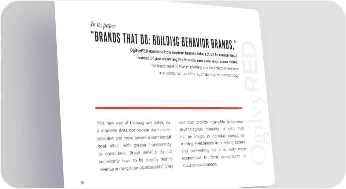 In its paper “BRANDS THAT DO: BUILDING BEHAVIOR BRANDS,” OgilvyRED explains how modern brands take action to create value instead of just asserting the brand’s message and raison d’étre. The basic tenet is that marketing is a service that delivers real consumer benefits, such as mobile connectivity. This new way of thinking and acting as can also provide intangible (emotional, a marketer does not obviate the need to psychological) benefits. It also may establish and move toward a commercial not be limited to individual companies goal, albeit with greater transparency making investments in providing access to consumers. Brand benefits do not and connectivity, as it is likely more necessarily have to be directly tied to economical to form consortiums or revenue or margin (tangible benefits). They industry associations. 80