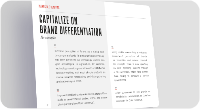 INTANGIBLE BENEFITS CAPITALIZE ON BRAND DIFFERENTIATION For example: 01 02 Increase perception of brand as a digital and Using mobile connectivity to enhance contemporary leader. Brands that have previously consumers’ perceptions of brands not been perceived as technology leaders can as innovative and service oriented. gain advantages. In agriculture, for instance, For example, Tesla is now updating technology is making vast strides to enable better its cars’ operating systems through decision-making, with such simple products as a 3G connection, which frees owners mobile weather forecasting, and data-gathering from having to schedule a service and data-analysis tools. appointment. 03 04 Improved positioning vis-a-vis indirect stakeholders, Allow consumers to see brands as such as governmental bodies, NGOs, and supply beneficial to communities, as Coke has chain partners (see Coke Ekocenter). done with the Coke Ekocenter. 87