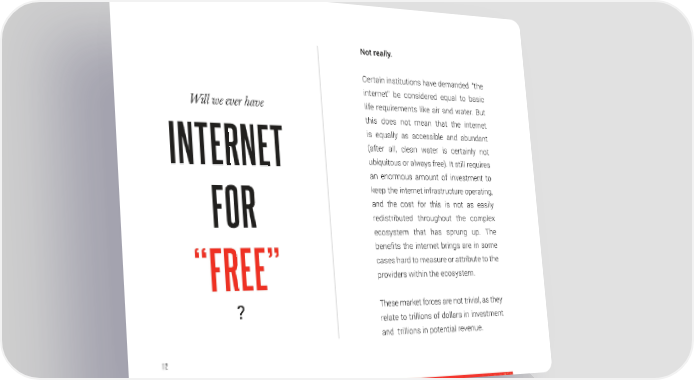 Not really. Certain institutions have demanded “the internet” be considered equal to basic Will we ever have life requirements like air and water. But this does not mean that the internet is equally as accessible and abundant (after all, clean water is certainly not INTERNET ubiquitous or always free). It still requires an enormous amount of investment to keep the internet infrastructure operating, and the cost for this is not as easily FOR redistributed throughout the complex ecosystem that has sprung up. The benefits the internet brings are in some cases hard to measure or attribute to the “FREE” providers within the ecosystem. ? These market forces are not trivial, as they relate to trillions of dollars in investment and trillions in potential revenue. 112