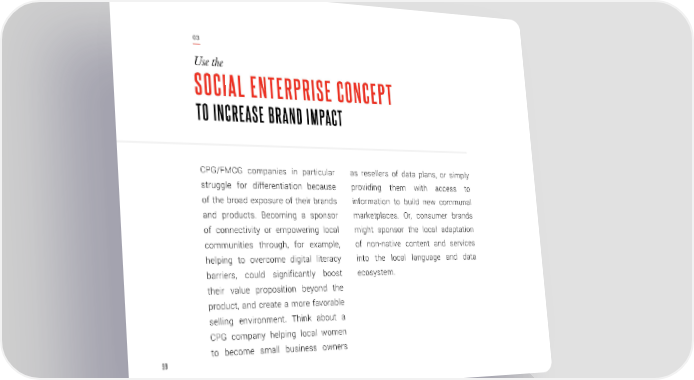 03 Use the SOCIAL ENTERPRISE CONCEPT TO INCREASE BRAND IMPACT CPG/FMCG companies in particular as resellers of data plans, or simply struggle for differentiation because providing them with access to of the broad exposure of their brands information to build new communal and products. Becoming a sponsor marketplaces. Or, consumer brands of connectivity or empowering local might sponsor the local adaptation communities through, for example, of non-native content and services helping to overcome digital literacy into the local language and data barriers, could significantly boost ecosystem. their value proposition beyond the product, and create a more favorable selling environment. Think about a CPG company helping local women to become small business owners 99