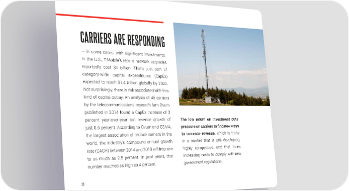 CARRIERS ARE RESPONDING — in some cases, with significant investments. In the U.S., T-Mobile’s recent network upgrades reportedly cost $4 billion. That’s just part of category-wide capital expenditures (CapEx) expected to reach $1.4 trillion globally by 2020. Not surprisingly, there is risk associated with this kind of capital outlay. An analysis of 45 carriers by the telecommunications research firm Ovum published in 2014 found a CapEx increase of 3 percent year-over-year but revenue growth of The low return on investment puts just 0.6 percent. According to Ovum and GSMA, pressure on carriers to find new ways the largest association of mobile carriers in the to increase revenue, which is tricky world, the industry’s compound annual growth in a market that is still developing, rate (CAGR) between 2014 and 2019 will improve highly competitive, and that faces to as much as 2.5 percent. In past years, that increasing costs to comply with new number reached as high as 4 percent. government regulations. 33