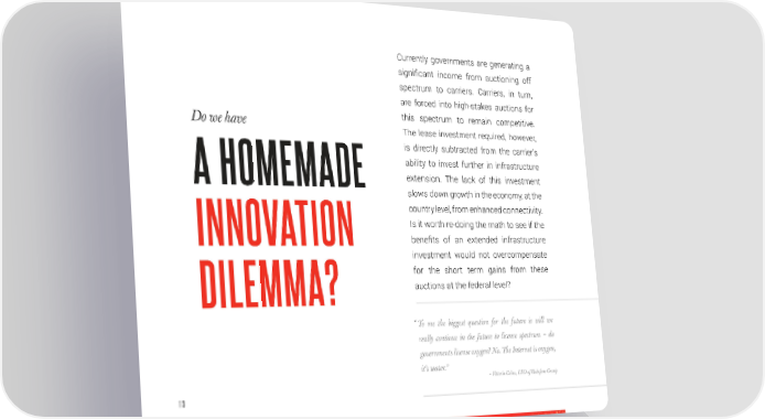 Currently governments are generating a significant income from auctioning off spectrum to carriers. Carriers, in turn, are forced into high-stakes auctions for Do we have this spectrum to remain competitive. The lease investment required, however, is directly subtracted from the carrier’s ability to invest further in infrastructure A HOMEMADE extension. The lack of this investment slows down growth in the economy, at the country level, from enhanced connectivity. Is it worth re-doing the math to see if the INNOVATION benefits of an extended infrastructure investment would not overcompensate for the short term gains from these DILEMMA? auctions at the federal level? “ To me the biggest question for the future is will we really continue in the future to license spectrum – do governments license oxygen? No. The Internet is oxygen, it’s water.” – Vittorio Colao, CEO of Vodafone Group 113