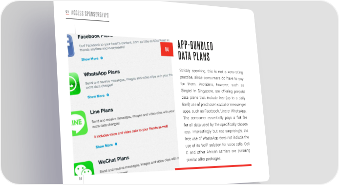 O1 ACCESS SPONSORSHIPS O4 APP-BUNDLED DATA PLANS Strictly speaking, this is not a zero-rating practice, since consumers do have to pay for them. Providers, however, such as Singtel in Singapore, are offering prepaid data plans that include free (up to a daily limit) use of prechosen social or messenger apps, such as Facebook, Line or WhatsApp. The consumer essentially pays a flat fee for all data used by the specifically chosen app. Interestingly but not surprisingly, the free use of WhatsApp does not include the use of its VoIP solution for voice calls. Cell C and other African carriers are pursuing similar offer packages. 54