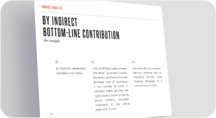TANGIBLE BENEFITS BY INDIRECT BOTTOM-LINE CONTRIBUTION For example: O6 O7 O8 By capturing government Through efficiency gains achieved With more efficient customer subsidies or tax breaks. with better value-chain visibility, servicing rerouting calls to decreased cost of acquisition, and messaging services using decreased cost of advertising. Facebook Messenger as a In the example of mFish, in customer service outlet. Indonesia, brands get direct and highly targeted access to specific groups, directing acquisition investments to the precise audience for a brand. 84