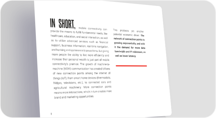 IN SHORT, mobile connectivity can This produces yet another provide the means to fulfill fundamental needs, like potential economic driver: The healthcare, education, and social interaction, as well network of connection points is as to utilize advanced services such as financial growing exponentially, and with support, business information, real-time navigation, it the demand for more data and banking and commercial transactions. But giving bandwidth and IP addresses, as more people the ability to live more efficiently and well as lower latency. increase their personal wealth is just part of mobile connectivity’s promise. The growth of machine-to- machine (M2M) communication has created billions of new connection points among the internet of things (IoT), from smart-home devices (thermostats, fridges, televisions, etc.), to connected cars and agricultural machinery. More connection points means more interactions, which in turn creates more brand and marketing opportunities. 6