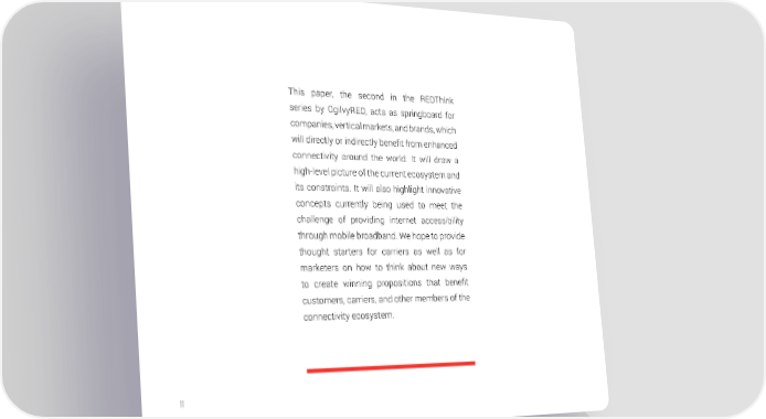 This paper, the second in the REDThink series by OgilvyRED, acts as springboard for companies, vertical markets, and brands, which will directly or indirectly benefit from enhanced connectivity around the world. It will draw a high-level picture of the current ecosystem and its constraints. It will also highlight innovative concepts currently being used to meet the challenge of providing internet accessibility through mobile broadband. We hope to provide thought starters for carriers as well as for marketers on how to think about new ways to create winning propositions that benefit customers, carriers, and other members of the connectivity ecosystem. 11