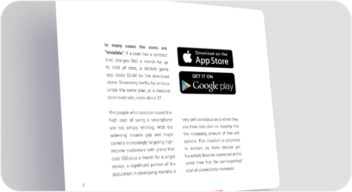 In many cases the costs are “invisible.” If a user has a contract that charges $60 a month for up to 6GB of data, a 360MB game app costs $3.60 for the download alone. Streaming Netflix for an hour under the same plan, at a medium download rate, costs about $7. The people who complain about the high cost of using a smartphone very self-conscious as to when they are not simply whining. With the use their data plan vs. tapping into widening income gap and major the increasing amount of free wifi carriers increasingly targeting high- options. This situation is projected income customers with plans that to worsen, as more devices per cost $60-plus a month for a single household become connected at the device, a significant portion of the same time that the per-household population in developing markets is cost of connectivity increases. 17