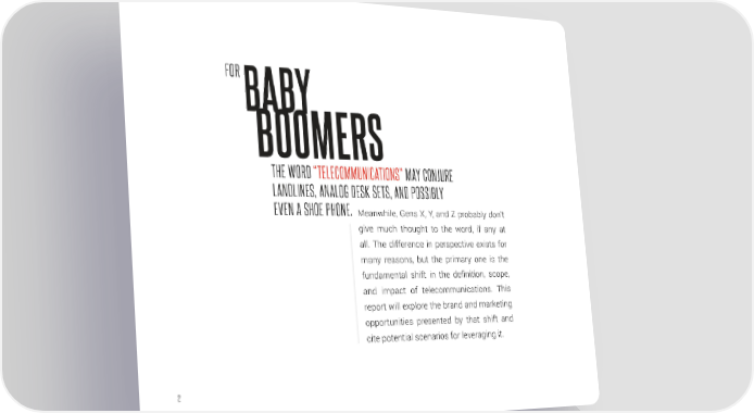 FORBABY BOOMERS THE WORD “TELECOMMUNICATIONS” MAY CONJURE LANDLINES, ANALOG DESK SETS, AND POSSIBLY EVEN A SHOE PHONE. Meanwhile, Gens X, Y, and Z probably don’t give much thought to the word, if any at all. The difference in perspective exists for many reasons, but the primary one is the fundamental shift in the definition, scope, and impact of telecommunications. This report will explore the brand and marketing opportunities presented by that shift and cite potential scenarios for leveraging it. 2